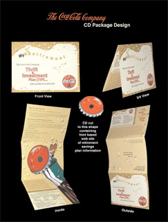 This is an interactive CD Mailer for Coca Cola. The CD is shaped like a bottle cap, which contains The Coca Cola Company's Retirement Brochure in HTML format.
